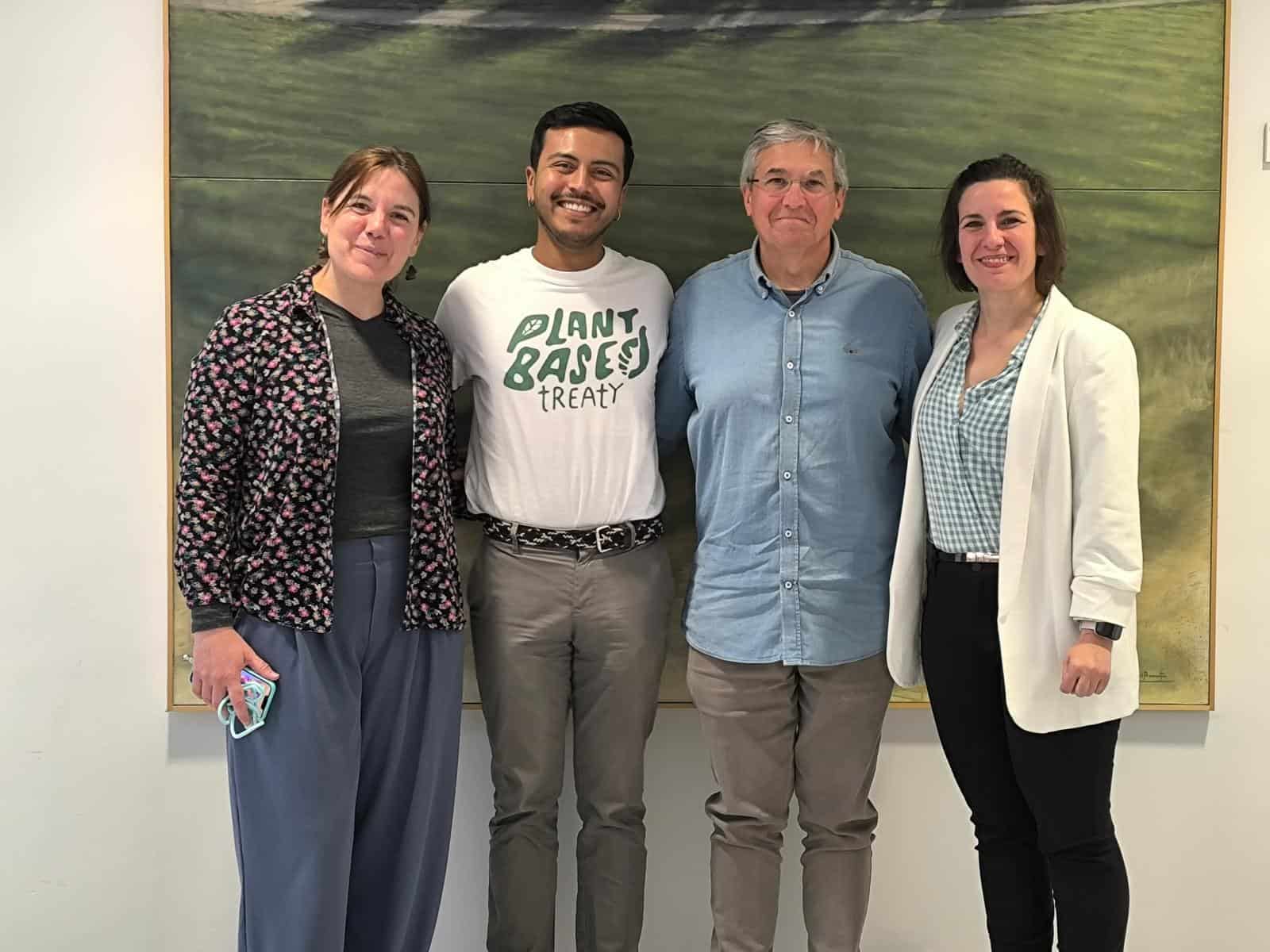 Photo taken minutes after the Plant Based Treaty motion was passed in Getafe. From left to right: Alodia Pérez, General Coordinator of Ecological Transition in Getafe; Juan Casadiego, City Campaigner for the Plant Based Treaty; Jesús Pérez, Councillor for Ecological Transition and the Environment; and Ana Isabel González Mariscal, Third Deputy Mayor and Head of the Department of Citizen Participation and Neighborhood Action.